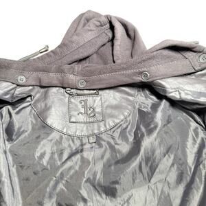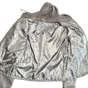 J2 Gray Faux Leather Womenโs Jacket Cotton Hood Zipper Pockets Size Large Punk