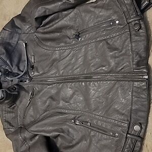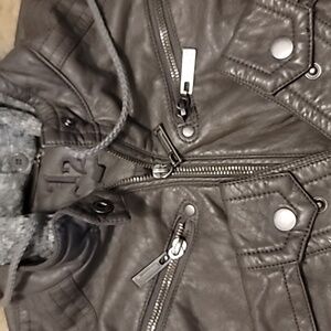 Gray / Lavender Leather Jacket With Gray Knit Hood
