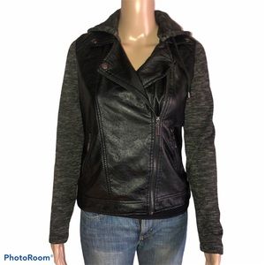 In excellent condition. Faux leather zippered front. Sweatshirt knit sleeves. Front zippered pockets. Detachable knit hood. 17” pit to pit x 21” long