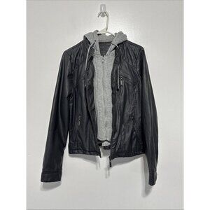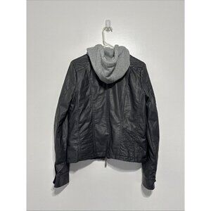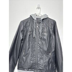J2 Women's Gray Leather Jacket Faux Size L Detachable Hood Lining Warm