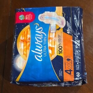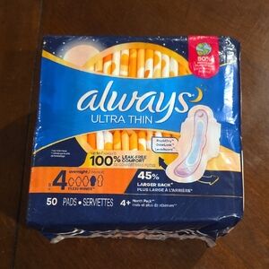 Always Ultra Thin pads with wings. Designed for overnight use. Provides 45% larger back for extra protection. Includes 50 pads.