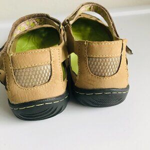 J-41 Kelly, Adventure On, Beige, Vegan, Mary Jane style Comfort Shoes. Condition is Pre-owned. In really good used condition. With cutout floral design. Adjustable fastening w/ hook & loop, Jeep engineered traction soles, Casual shoe.