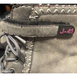 This is a pair of gray J-41 Srina vegan leather ankle boots in a women's size 6. These boots are in good used condition (SEE PHOTOS AND READ DESCRIPTION).