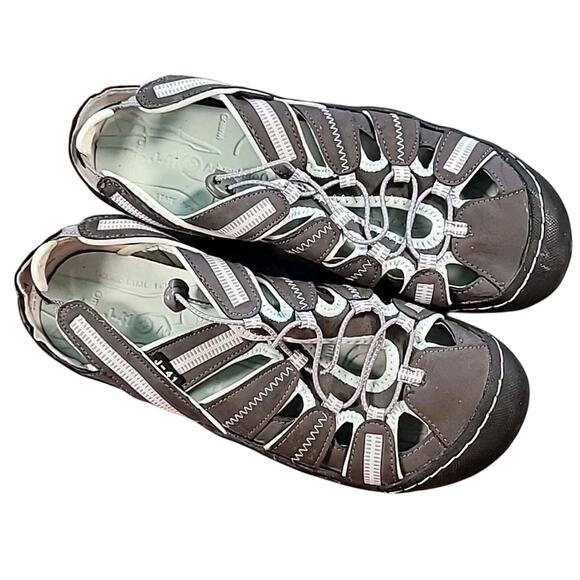 Adventure-ready J-41 by Jambu water sandals. Black with blue accents, women’s 8M. Good condition overall with some flaking on back (shown). Perfect for hiking, beach, or casual wear.
