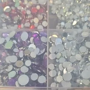 Assorted rhinestones in a clear organizer. Perfect for crafts and decoration. Includes blue, purple, green, yellow, and clear stones.