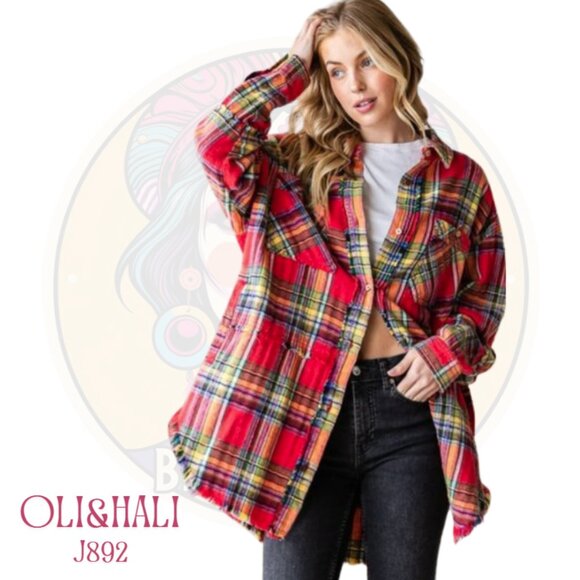 J892 OLI & HALI Red Mineral Washed Mixed Plaid Flannel Button Up Shirt