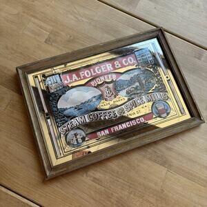 The vintage mirror is an advertising piece for J.A. Folger & Co., featuring the Pioneer Steam Coffee Spice Mills brand. The mirror likely showcases the company's historical roots and their dedication to quality coffee and spices. As a collectible and piece of memorabilia, this mirror would be a charming addition to any collection of vintage advertising items, reflecting the nostalgia and craftsmanship of bygone eras.
