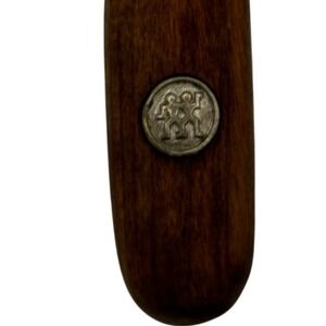 Vintage J.A. Henckels Friodur steak knife. High Quality. A testament to quality craftsmanship, this knife features a sharp, serrated edge designed to effortlessly slice through steaks and other meats. The rich, warm-toned wooden handle provides a comfortable and secure grip, accented by a decorative medallion at the base. Handle has been conditioned with food grade mineral oil. Blade may need sharpening. See photos for measurements and detailed condition.