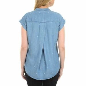 Jachs Girlfriend Chambray top. Button down closure. Two pockets at each side of chest. Light blue. White and silver buttons. Additional button included on fabric care tag. Small white palm tree graphic throughout. Collared neck. Relaxed fit. Womens size large.