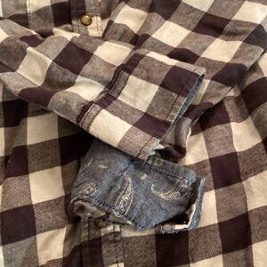 Cute blue paisley inside and cuffs (can be rolled or left unrolled). Snap closures (not buttons). Approximate measurements laying flat: 20” PTP, 26” length. Really cute! Very good condition.