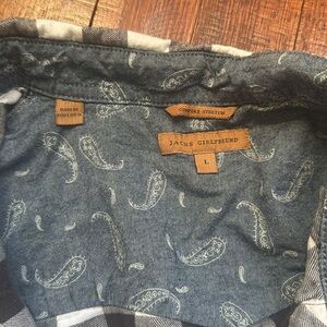 Jachs Girlfriend buffalo plaid snap button flannel with paisley denim inner accents. Good condition.