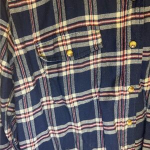 Cozy and classic Jachs Girlfriend women’s plaid button-down shirt in navy with red and white accents. Features two chest pockets, gold-tone snap buttons, and soft flannel-like fabric. Gently worn, no flaws, excellent condition.