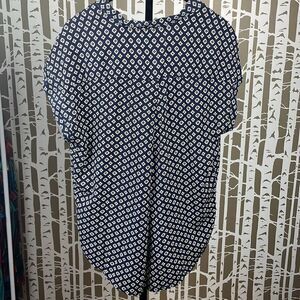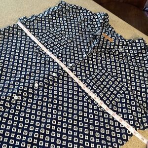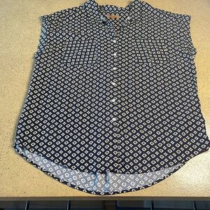 JACHS Girlfriend Cap Sleeve Button Down Short Sleeve Printed Blouse navy & cream. JACHS casual wear pairs effortless style with quality fabric (100% rayon) for truly versatile apparel. This printed cap sleeve shirt is a modern take on the classic button-down. Complete with twin chest pockets, white buttons, navy blue and off white / cream allover pattern, curved hi-low hemline, spare button on the tag. Gently worn with no flaws to note. See pics for measurements.