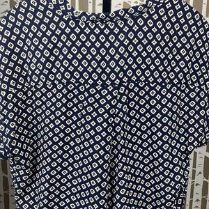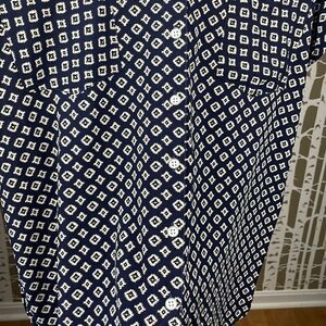 JACHS Girlfriend Cap Sleeve Button Down Short Sleeve Printed Blouse navy & cream. JACHS casual wear pairs effortless style with quality fabric (100% rayon) for truly versatile apparel. This printed cap sleeve shirt is a modern take on the classic button-down. Complete with twin chest pockets, white buttons, navy blue and off white / cream allover pattern, curved hi-low hemline, spare button on the tag. Gently worn with no flaws to note. See pics for measurements.