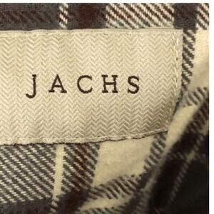JACHS heavyweight flannel shacket in tan, brown, cream, and grey plaid. Made from thick 100% cotton for warmth and durability, ideal for fall and winter layering. Features a full button front, button cuffs, and classic J.A.C.H.S MFG.CO branding. This rugged, country-inspired plaid shirt jacket works perfectly with jeans, boots, and everyday casual wear. Excellent preowned condition from a smoke-free home; model photo used only for fit reference. Machine washable for easy care. Measurements available upon request.