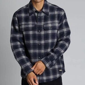 Thick. Plaid in Blue and White, Button Down Front, Two Buttoned Chest Pockets, Buttoned Cuff Long Sleeves, Quilted Lining in Navy.