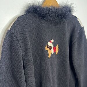 JACK B. QUICK • Vintage 90s • Art To Wear Christmas Novelty Print Dog Animal Holiday Theme Feather Collar Button Down Cardigan Sweater