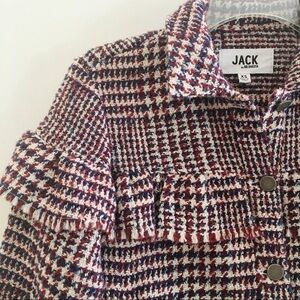 Jack by BB Dakota You Better Work Jacket. Plaid textured workman jacket with raw edge ruffle detail. Button front closure. Long sleeves. Poly / wool blend.