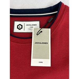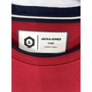 Showcase your style with this JACK & JONES Men's Core Logo T-Shirt. The pullover design features a round neckline and short sleeves, making it perfect for casual occasions. The shirt is made of lightweight, easy-care cotton jersey material with a unique red and blue stripe pattern and the brand's logo accents, giving it a designer touch. It's suitable for all seasons and can be machine washed for easy care.