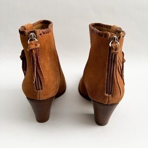 Crafted from equal parts elegant and chic, this suede bootie features whipstitch trim around the cuff and a tassel detail at the side. The softly pointed toe and stacked leather heel creates a flattering silhouette on this pair.