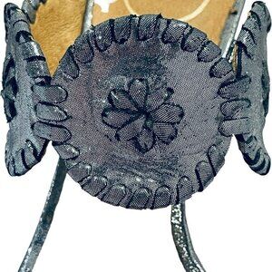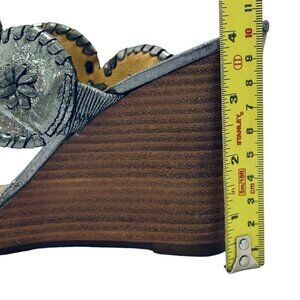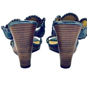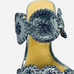 JACK ROGERS ~ Luccia leather wedge/sandals. Silver-grey metallic with medallion straps. Women's Size 10M. Wedge heels are 4" tall. Rubber sole. Lightly cushioned insole. Without original box.