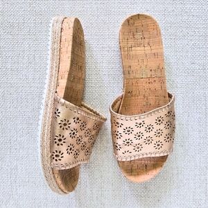 JACK ROGERS Metallic Rose Gold Floral Eyelet Leather Cork Slides Sandals 6.5