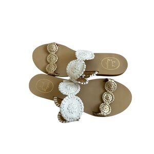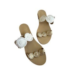 Elegant white and gold flat sandals by Jack Rogers, crafted from premium leather for comfort and style. Perfect for casual outings or dressing up a summer ensemble. Versatile and timeless design in size 9.5.