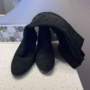 Jack Rogers woman’s black suede zip up in the back of the boot knee high wedge boots they are a size 9.4. They are super cute and in good condition.