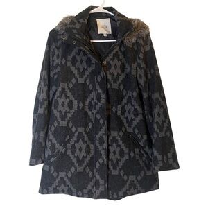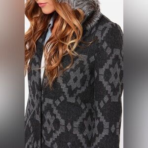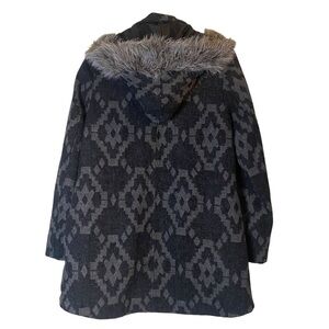 Geometric patterns take over this sweet felt coast with a full-length zipper hidden beneath a snapping placket at front, plus a hidden drawstring to cinch the waistline. Faux fur-trimmed hood skirts a funnel neckline, and two diagonal pockets at waist side. Model is wearing a size X-small.