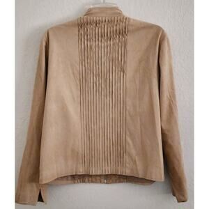 Tan zip up jacket by Coldwater Creek. This jacket is in a tan color with long sleeves. The sleeves have a notch at the cuff. It has lines of small ruffles and small pleated material vertical down the front on each side of the zipper. The back has the same pleated vertical down the middle, with no ruffles. It is a soft polyester material that gives off a look of suede. It is lined, but this would be a light weight jacket. This is SIZE MEDIUM.