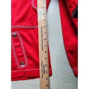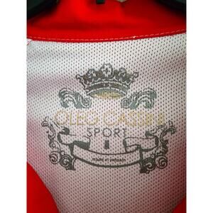 Nice red jacket by Oleg Cassini Sport. This is a solid red jacket with white thread trim details. There are slit front pockets. It is unlined, except for the top half of the back has a netting material under the back fabric that lifts up at the bottom of the piece that hits in the middle of the back. This might make more sense if you review the pictures. It is long sleeve with elastic at the cuff. The size and material tag has been cut out. It feels like a heavy cotton material, but could be a polyester. The sizing looks like a SIZE SMALL.