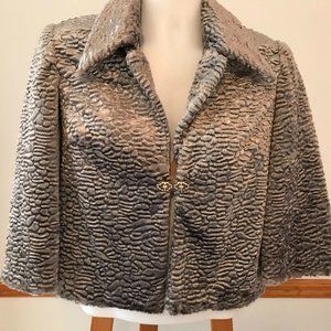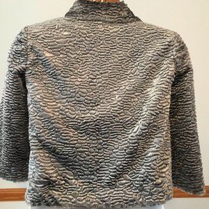 Jackie Jon New York Misses Size Small Lined Soft Velour Dressy Jacket. 3/4 sleeves. Color is Silver/Pewter. Rhinestone closure (hook & eye type). Acetate/Nylon/Cotton, dry clean only. Polyester lining. Measures 19" long at center back and approx. 19.5" across front from armpit to armpit. Sleeves measure 17" long. Weighs 1 lb. 4 oz. No wear and from smoke-free home. Please note that care label is missing.