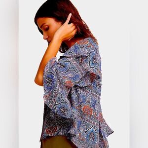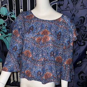 JACK bb Dakota Eat Slay Love Printed Top flare sleeve blue & rust