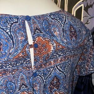 This flowy, loose-fitting top features a wide neckline and short, flared sleeves in shades of blue and orange. The vibrant and intricate pattern adds a bold touch to the relaxed style.