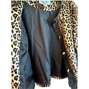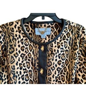 JACLYN SMITH, NWOT, STYLISH CHEETAH PRINT JACKET. SOFT VELVETY FEEL FABRIC, FAUX BLACK LEATHER TRIM WITH GOLD TURN LOCK BUTTONS, 2 HIDDEN FRONT POCKETS, FULLY LINED. IN NEW CONDITION. SIZE XL