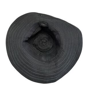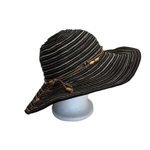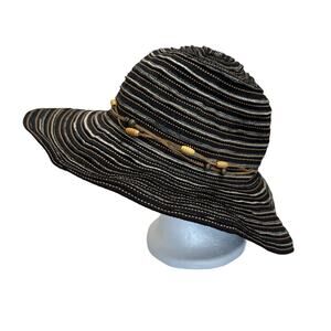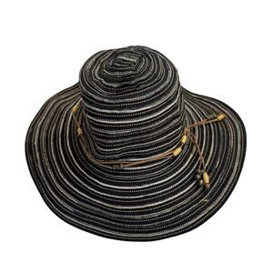JACOBSON HAT Black Braided Beaded Sun Hat. One Size Fit Most Adults. Black main with tan and white stitching and tan and brown cord with beading around the crown. Lightweight. Perfect for travel or a day at the beach. Excellent condition — no rips, stains, or holes.