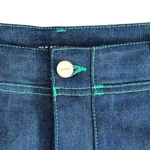 Non-stretch organic cotton denim skirt. Contrast stitching in green throughout.