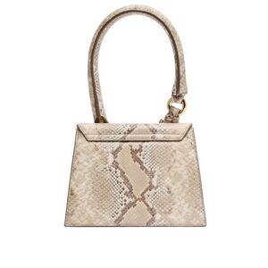 Grey and beige ‘Le Chiquito Moyen Boucle’ shoulder bag from Jacquemus. Made from calf leather with a snakeskin effect, this design fastens via a snap and showcases a metal logo plaque on the front, one half-round handle with a decorative buckle, gold-tone metal hardware, one internal compartment with a card slot and a detachable and adjustable shoulder strap.