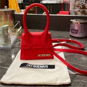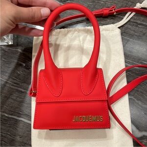 Width 3,9" Firm on price!! The Jacquemus Red Mini Bag is a striking accessory that combines a vibrant hue with a sleek, architectural design. Its compact size and structured form make it a standout piece, while the distinctive curved top handle adds a touch of elegance. This mini bag is perfect for those who appreciate bold fashion statements and quality craftsmanship.
