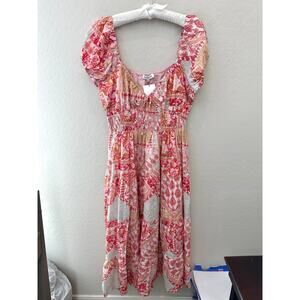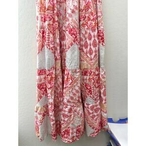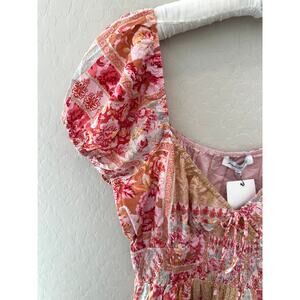 Step into effortless bohemian charm with this brand new Jacquie The Label maxi dress in a size Large. The rich patchwork print in sunset tones of red, pink, mustard, and ivory is perfect for festivals, brunches, or vacation getaways. Featuring romantic puff sleeves, smocked bodice for a flattering fit, and a lightweight cotton blend lining, this dress is as comfortable as it is eye-catching.