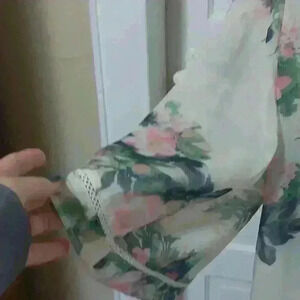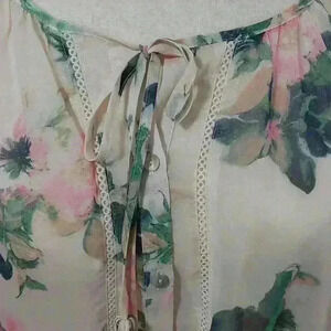 Excellent condition. Semi Sheer and light weight. Will need a chemise worn underneath. Very loose and flowy size M. Pit to pit measures 24". Shoulder to hem 24". A size large can wear and still look fabulous. 100% polyester.