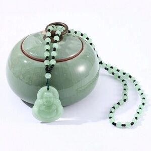 Beloved for its deep, diverse variations of color, alluring luster, and remarkable durability, the jade stone has captivated hearts and minds for centuries. Its earliest uses date back to the Stone Age, when civilizations painstakingly crafted sharp axe heads and traded carved jade objects as currency. Master craftsmen across centuries and cultures have fashioned a swath of objects from the in-demand stone, including jade jewelry, plaques, sculptures, and jewelry. Proponents of metaphysical gems believe that the jade stone provides its wearer with enhanced clarity and even access to the spiritual world; there are many published guides available on the different types of of jade and their ability to increase wisdom and intuition. Carved jade pendants have long been worn as protective talismans, and ritualistic masks and incense burners crafted from jade have been a part of religious ceremonies from Mesoamerica to ancient China. Hand Carved Jade Maitreya Buddah Pendant Guaranteed Authentic Pendant: 2” Beaded Necklace-14.5”