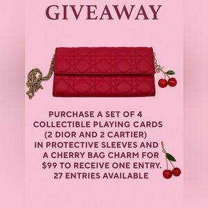 PURCHASE A SET OF 4 COLLECTIBLE PLAYING CARDS (2 DIOR AND 2 CARTIER) IN PROTECTIVE SLEEVES AND A CHERRY BAG CHARM FOR $99 TO RECEIVE ONE ENTRY. 27 ENTRIES AVAILABLE.