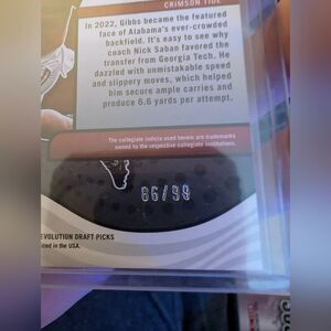 The product is a rare and collectible Jahmyr Gibbs 2023 Panini Chronicles Draft Picks trading card from the Revolution insert set. This Cosmic parallel card features serial numbering and is limited to a print run of only 99 copies. As a rookie card of the Alabama Crimson Tide player, it is a highly sought-after item among football trading card enthusiasts looking to own a piece of NCAA history. With its unique design and limited availability, this card is a valuable addition to any sports trading card collection.