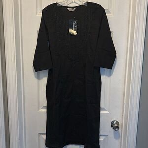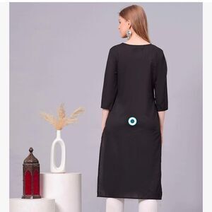 Style & Pattern : Black indian kurtis for women || Neckline : V-Neck || Sleeves: 3/4th Sleeves. Work : Embroidery Work on Kurti