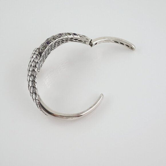A fabulously detailed sterling silver and 14kt. gold JAI Peacock cuff bracelet by John Hardy featuring amethyst and peridot gemstones. The bracelet is 1 inch wide at the center of the Bird and tapers to 2/8 inch at the ends. It has a 6.5 inch circumference on the inside and a hinge on one side for on and off ease. It is in wonderful pre-owned condition and will come to you with its original box and dust bag. Marked JAI along with 925, 14K, Thailand on the inside.