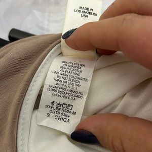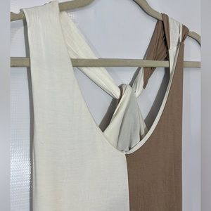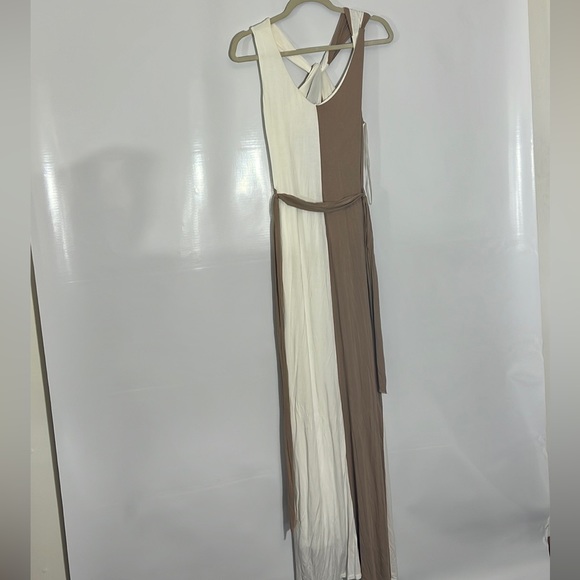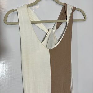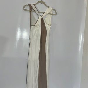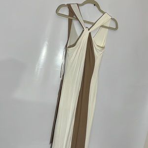 Dress with two colors, very beautiful, long, low-cut, thick, in excellent condition, the colors are beige and light brown, stretch, with a fabric belt to adjust at the waist.