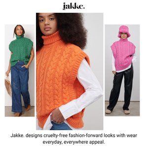London designer JAKKE. delivers cruelty-free luxe designs from edgy streetwear to everyday chic styles! The JAKKE. Sade Sweater delivers a sleek refined look with an edgy street vibe. Change up your look to fit your plans, pair with trousers & heels for a business dinner or with jeans, combat boots & a beanie for a funky street festival. Unbelievably soft and knitted from recycled polyester blend it features a slightly oversized fit, cable knit detailing, ribbed trim, and a chunky ribbed turtleneck. Retail $210
