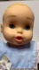 Baby Doll 2016 blonde hair blue eyes wearing a vintage outfit in very good condition makes crying and laughing and more sounds tested works needs 3 AAA batteries. Doll has tiny spot on chin and spot on one leg