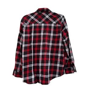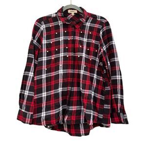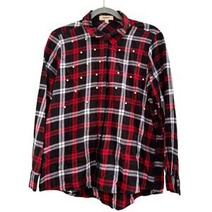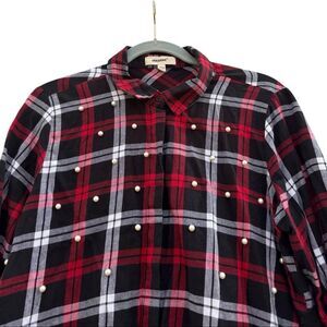 Plaid cotton button-down shirt with faux pearl embellishment.